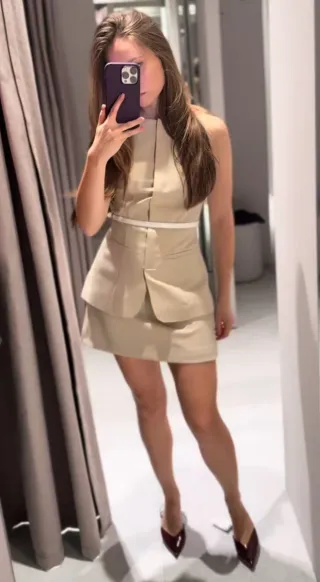 Vestido de Zara de corte formal. - Diseño sin mangas. - Cinturón blanco fino. - Falda con vuelo. Talla L, pero talla pequeño como M