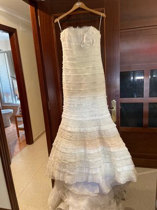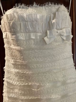 Precioso vestido de novia de color blanco roto. Es un diseño elegante y sofisticado, ideal para una boda romántica. - Está confeccionado con encaje delicado y capas de tul. - Presenta un corpiño de corte imperio con un bonito lazo en la cintura. - La falda es de corte sirena, con varias capas de encaje que le dan mucho volumen. - El vestido está en muy buen estado, listo para lucirlo en tu gran día.