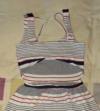Vestido de verano a rayas blancas, azules y rojas.