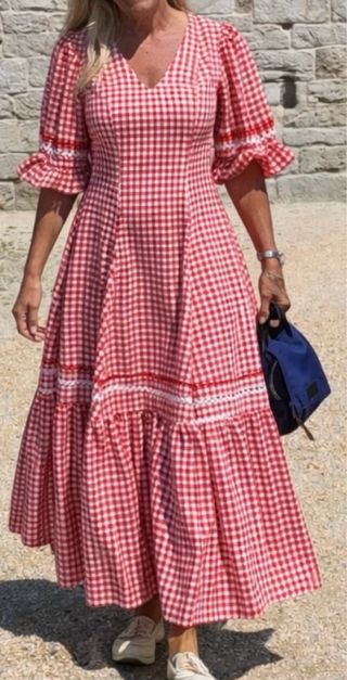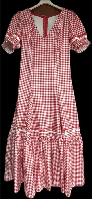 Vestido de romería a estrenar con un diseño de cuadros. - Estampado de cuadros vichy. - Mangas abullonadas con volantes. - Detalle de pasamaneria zigzag en mangas y falda. -tela de popelin fina.