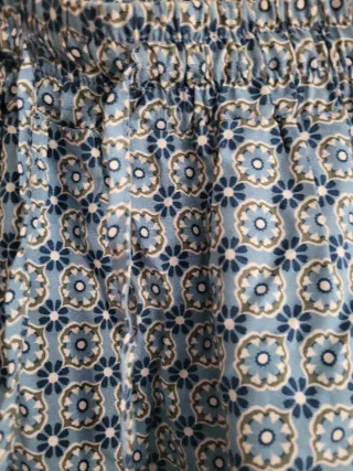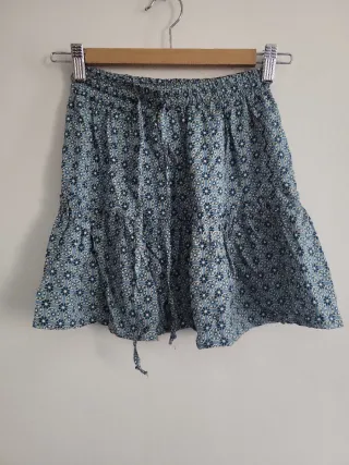 Falda corta con un bonito estampado floral en tonos azules y blancos. Tiene cintura elástica y cordón ajustable. - Diseño con volantes. - Estampado floral repetido. - Cintura elástica con cordón.