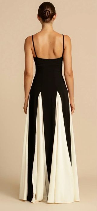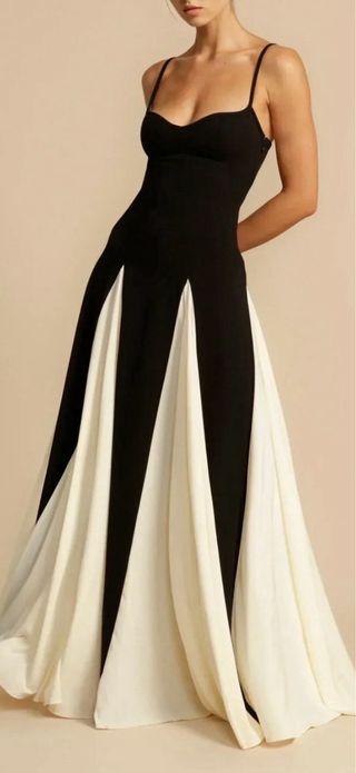 Elegante vestido largo con un diseño bicolor en negro y blanco. Ideal para eventos especiales. - Tirantes finos. - Falda con paneles en contraste.