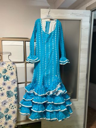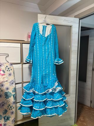 Vestido de flamenca con un diseño alegre y vibrante. - Estampado de lunares blancos sobre fondo azul. - Adornos de volantes en cascada en la falda. - Mangas largas con volantes. - Detalles de pasamanería roja en cintura y mangas.