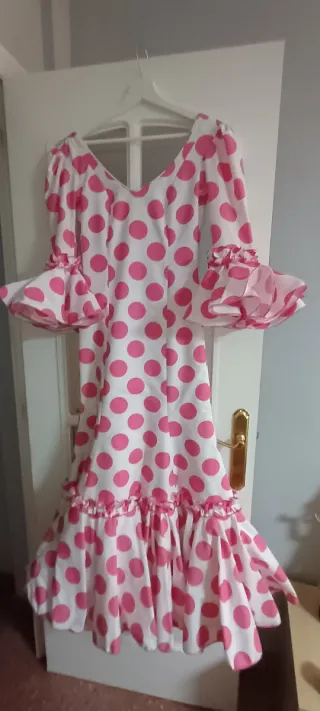 Vestido de flamenca con un diseño alegre y llamativo. - Estampado de lunares blancos sobre fondo rosa. - Mangas con volantes. - Volantes en la falda. La taya viene un poco mas pequeña, ya que equivale a una 42.
