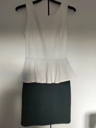 Elegante vestido con diseño de peplum. - Parte superior blanca. - Falda negra. - Sin mangas.