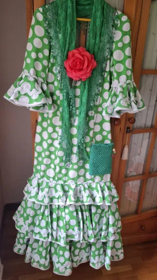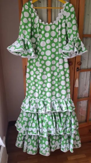 Vestido de flamenca con un alegre estampado de lunares. - Diseño con volantes en mangas y falda. - Cuello con acabado festoneado. - Mangas acampanadas con volantes. - Medidas: - Largo 1.45 - Cintura 94 - Pecho 92 - Cadera 109 - Manga 50