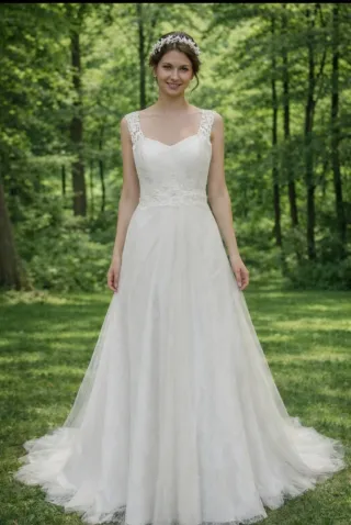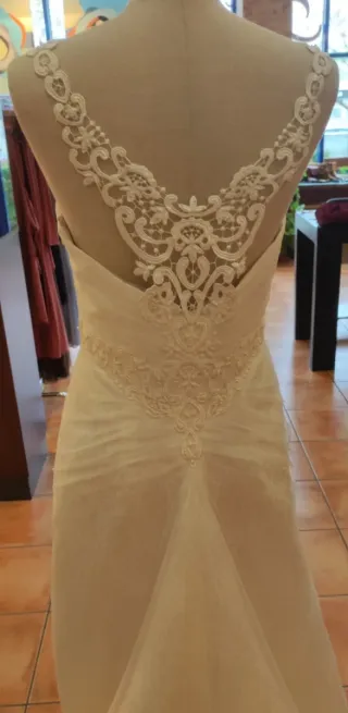 Vestido de novia de exposición, en perfecto estado. - Diseño elegante y romántico. - Tejido ligero y vaporoso. - Detalles de encaje en tirantes y cintura. - Escote corazón. - Falda con caída. - Incluye tocado a juego.