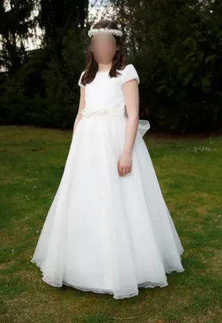 Vestido de comunión de color blanco roto. - Ligeros bordados en el cuerpo - Cinturón con lazo. - Falda vaporosa de tul, tiene 3 capas - Can can adaptable