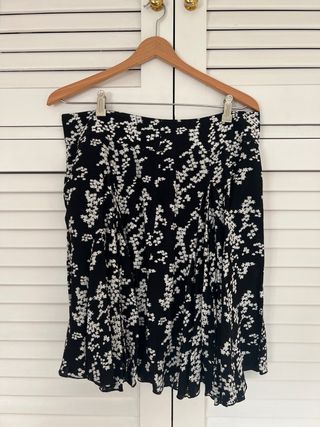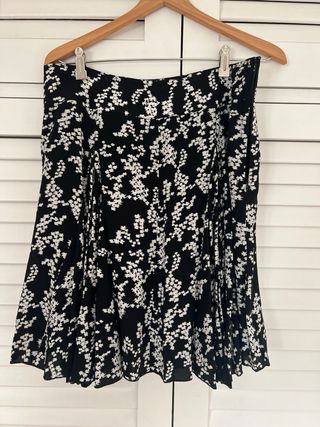 Falda corta con estampado de flores en blanco sobre fondo negro. Tiene un corte acampanado y es muy ligera. USADA SOLO UNA VEZ PARA PROBARLA, PERO NO ES MI ESTILO. SIN DESPERFECTOS - Diseño de flores pequeñas. - Cintura elástica.