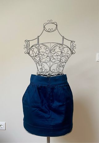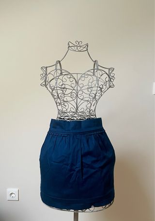 Falda abombada de color azul. - Diseño con pliegues en la cintura. - Bolsillos laterales y cremallera trasera.
