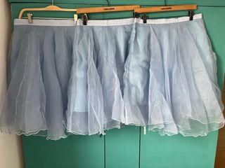 Conjunto de tutús de tul en tonos azul claro y blanco. Son vaporosos y con un acabado festoneado en el bajo. - Diseño ligero y voluminoso. por separado 24 euros cada uno -Miden uno 37 cms y dos 40 cms de cintura