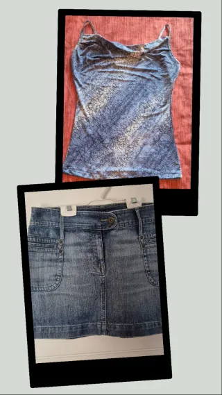 Conjunto de falda vaquera y top con estampado abstracto. - Falda vaquera de corte recto. - Top con tirantes finos y estampado en tonos azules y blancos.