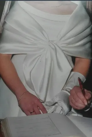 Elegante vestido de novia en color blanco, talla 44. Un diseño clásico y sofisticado. - Corte favorecedor. - Tejido de alta calidad. - Detalles de botones en la falda y de 2 metros de largo