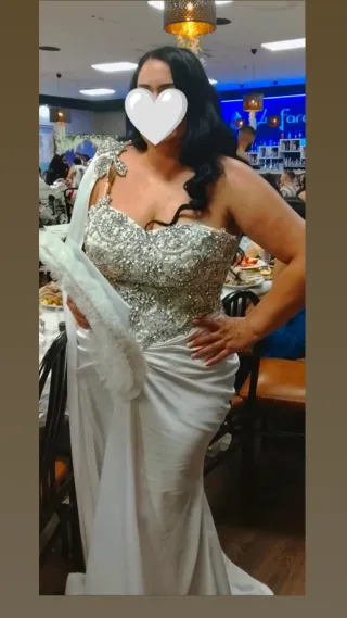 Vestido de boda gitana, blanco con corsé de pedrería plata (ajustable con cuerda y unido a la falda). Falda larga ajustada con pliegues en cadera y un poco de cola. Hombrera de piedra con manga larga caída. Talla 46 pero puede ajustarse a menos si es necesario. Un solo uso, en muy buen estado.