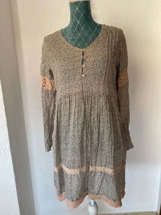 Vestido ligero, de manga larga, corto por encima de la rodilla. Es de estilo campero. Lo he usado muy poquito, por lo que el estado es muy bueno. Tiene detalles en ganchillo en mangas y falda, y botones en el pecho. Talla M