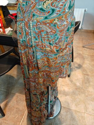 Falda bohemia con diseño muy original, corto por delante y largo por detrás ideal con botas camperas. Lleva unos colores que se llevan este año. Lleva goma en la cintura entonces sirve tanto para una S como para una M