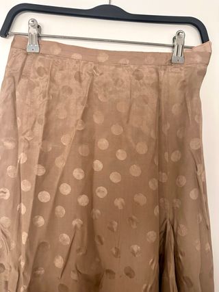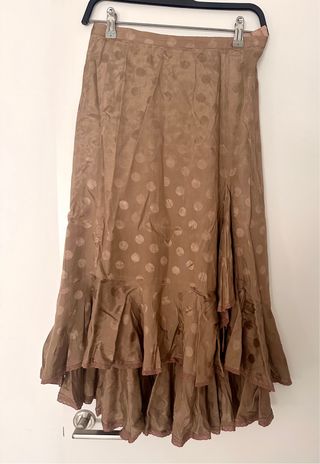 Ideal falda vintage color tierra con volante al final en estampado de lunares con vuelo, perfecta con camperas, perfecta con cuñas, perfecta con stilettos o sandalia alta Talla una 38 holgada, lleva goma parte de atrás