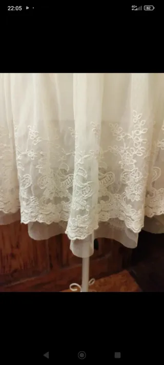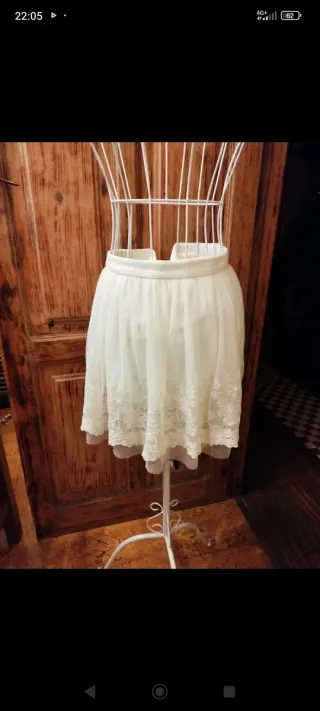 Delicada falda de tul en tono blanco roto/ beige, con elegante encaje bordado en el borde que le da un estilo romántico y femenino. Su tela ligera y con caída suave aporta movimiento y comodidad, ideal para outfits casuales, vintage o para ocasiones especiales. Cintura cómoda, diseño versátil y fácil de combinar con blusas, tops o suéters y espectacular con camperas y cazador vaquera que es como yo la usaba