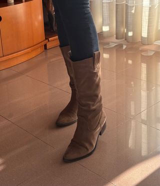 ¡Dale un toque boho y campero a tu look con estas preciosas botas! Pongo a la venta estas botas altas de ante en un versátil color marrón/camel, perfectas para cualquier estación. Tienen un diseño atemporal de estilo cowboy, con la caña ligeramente arrugada que les da un aire muy casual y estiloso. Son increíblemente cómodas gracias a su tacón bajo y ancho, ideal para llevarlas todo el día sin cansarte. El acabado en ante es suave y de buena calidad. Usadas muy pocas veces y cuidadas con cariño. Son las botas perfectas para combinar con vaqueros, faldas o vestidos. ¡No las dejes escapar!