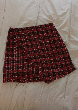 Falda de cuadros con un diseño moderno y detalles únicos. - Estampado a cuadros en tonos rojos, blancos y negros. - Acabado con flecos en el bajo. - Detalle de botones dorados en la parte delantera.