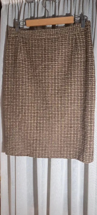 Falda midi de invierno con un diseño de cuadros elegante. Con forro y cremallera lateral. Tejido elástico de poliamida, poliéster, lana y otros. Talla 44, pero es más pequeña. Cintura 80 cm. Largo 70 cm. - Tejido texturizado. - Patrón de rombos y líneas.