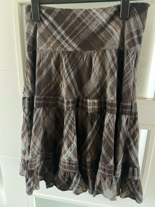 Falda con un diseño de cuadros en tonos marrones y azules. Su corte acampanado le da un movimiento elegante. - Tejido texturizado. - Diseño de cuadros. - Corte acampanado.