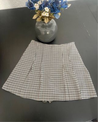 Falda de estilo plisado con un clásico estampado de cuadros. Talla S. Marca Stradivarius - Diseño de cuadros en blanco y negro. - Falda con vuelo. - Cintura elástica.