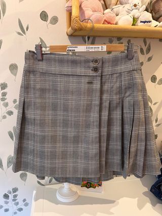 Falda pantalón de cuadros estilo colegiala. - Diseño a cuadros en tonos grises y marrones. - Detalle de botones decorativos en el lateral.