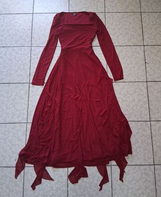 Vestido largo de color rojo, ideal para ocasiones especiales. Es de un tejido suave y fluido, diseño cuadrado de cuello y falda con detalle de volantes. Esta prácticamente nuevo, solo usado una vez.