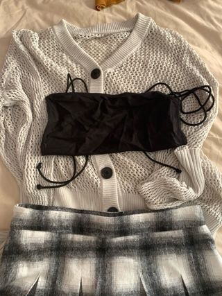 Conjunto de tres prendas para un look completo. - Cardigan de punto calado. - Top negro de tirantes. - Falda plisada de cuadros.