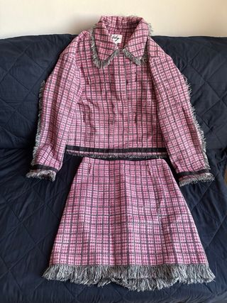Chaqueta de diseño con estampado de cuadros. Falda corta a juego - Mangas y parte inferior en color negro. - Doble botonadura frontal. - Bolsillos con cremallera. - Cinturón