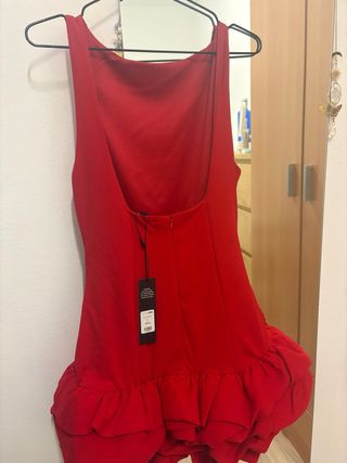 Vestido de fiesta en color rojo, con un diseño moderno y favorecedor. - Escote cuadrado. - Falda con volantes. - Cremallera trasera.