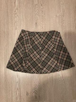 Falda corta con estampado de cuadros. - Diseño de cuadros en tonos verdes y blancos. - En perfecto estado, poco uso, puesta 2 o 3 veces. - Cintura con trabillas.