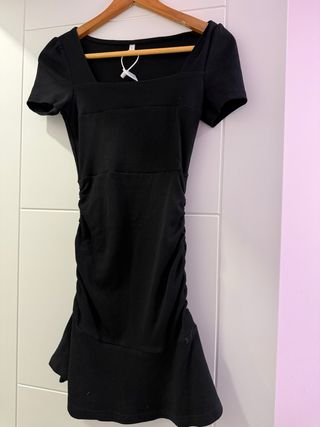 Falda negra con un diseño moderno y favorecedor. - Tejido elástico acanalado. - Detalle de fruncido lateral. - Bajo con volante. - Escote cuadrado.