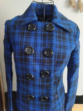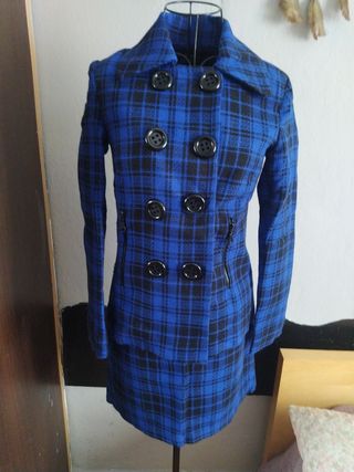 Chaqueta con un llamativo estampado de cuadros. - Diseño de doble botonadura. - Cremalleras decorativas en los bolsillos. -La falda es recta, tiene cremallera en la espalda y detalle de cinturón con hebilla.
