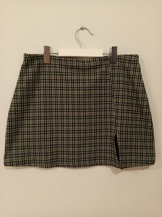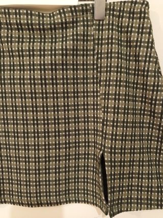 Minifalda de cuadros pequeños. Tonos verde oliva. Es elástica, no lleva ningún tipo de cierre ni cremallera. Corte recto, con pequeña abertura delante (10 cm). Versátil y elegante a la vez. De Pull&Bear, talla S. Medidas: 34 cm de largo.