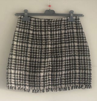 Lote minifaldas talla Xs-S 1. Falda-pantalón con estampado de cuadros escoceses 2. Minifalda recta de estampado para de Gallo blanco y negro con cierre de cremallera de Bershka 3. Falda de tablas de sarga color negro