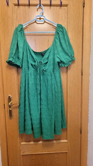 Vestido verde con frunce regulable en el pecho, mangas cortas abullonadas y escote cuadrado en la espalda de panel de abeja, corte bajo el pecho, falda amplia y vaporosa, largo a media pierna. Lo compré el año pasado y este me queda muy grande. Puesto 2 veces.