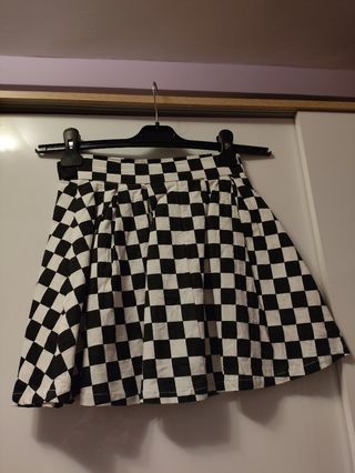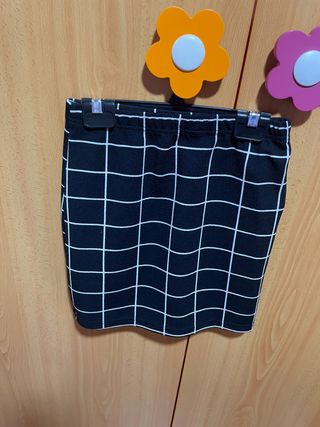 Minifalda negra con cuadros blancos. De Bershka, talla L. Es elástica pero no da mucha talla. En buen estado, usada 1 vez. Se incluyen medidas en las fotos
