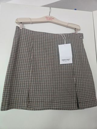 Minifalda marca Green Coast a estrenar, talla 34 aunque da más talla. Cremallera lateral, dos pequeñas aperturas delanteras y forro interior. 75% viscosa, 15% poliamida, 7% poliéster y 3% elastano, y forro 100% poliéster. Medidas 35 cintura x 37 largo.