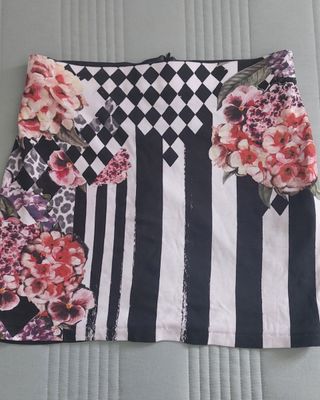 Preciosa minifalda de Zara, con estampado combinado de flores y cuadros. Es una prenda alegre y original, ideal para darle un toque especial a cualquier look. - Diseño único con estampado floral y de cuadros. - Corte mini. - Cierre de cremallera invisible. - Esta muy usada colores un poco desgastados