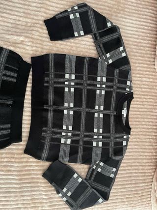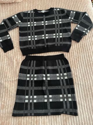 Conjunto de dos piezas de punto con estampado de cuadros. - Jersey de manga larga. - Falda a juego.