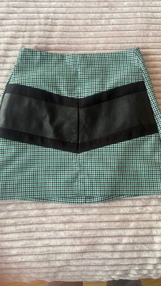 Falda con estampado de cuadros y detalle en polipiel. - Diseño de cuadros pequeños en verde y negro. - Panel central en polipiel negra. - Corte moderno y favorecedor.