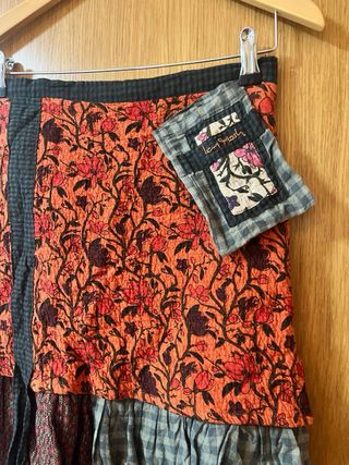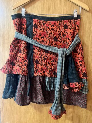 Falda original de Ian Mosh con un diseño único y llamativo. - Estampado floral en tonos naranjas y negros. - Detalles en tela de cuadros grises. - Cinturón a juego. - Diseño con varias capas y volantes.