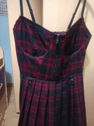 Vestido de fiesta estilo Pinup con falda con volumen parte superior de terciopelo negro, y falda armada de cuadros con brillo, longitud por encima de la rodilla. Talla 36 usado pero en buen estado