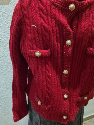 Conjunto de chaqueta de punto y falda. - Chaqueta de punto rojo con botones. - Falda de cuadros gris. Cada pieza 15,00, se puede vender por separado