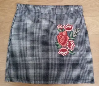 Minifalda de cuadros con un bonito detalle de bordado floral en la parte delantera. - Diseño de cuadros grises. - Bordado de rosas rojas y rosas.