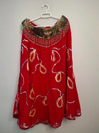 Falda larga y vaporosa, ideal para danza del vientre o espectáculos. - Diseño con detalles en dorado y rojo. - Adornada con abalorios y lentejuelas. - Cintura elástica para mayor comodidad con broches seguros. Sujetador con lentejuelas y abalorios imitando cristal en el inferior que aportan dinamismo al movimiento. Talla 38 Todo hecho a mano. Todo el conjunto por 43 € o por separado ofrece un precio.
