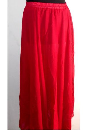 Falda larga roja de poliéster tipo gasa, muy ligera y con caída preciosa. Tiene gran vuelo y abertura lateral en la pierna, perfecta para dar movimiento al bailar 💃 Ideal para: • Danza del vientre • Flamenco o sevillanas (ensayo o espectáculo) • Disfraz de gitana / latina • Actuaciones, teatro o shows • Sesiones de fotos o vestuario de escenario. El rojo es intenso y llamativo, ideal para escenario. 🔹 Cintura con goma elástica, con velcro. Medida 75 cm. 🔹 Equivale aprox. talla M, L o incluso XL. Largo 90 cm