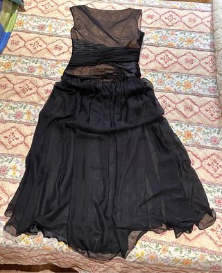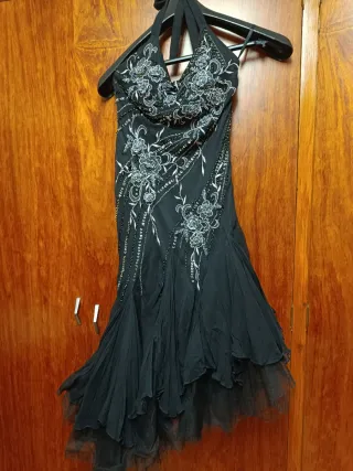 Elegante vestido de fiesta con detalles que lo hacen único. - Tirantes finos. - Cuerpo fruncido en la parte superior. - Fajín de terciopelo negro con lazo. - Falda con volantes y adornos. Talla 44 pero la talla no corresponde a la talla real.